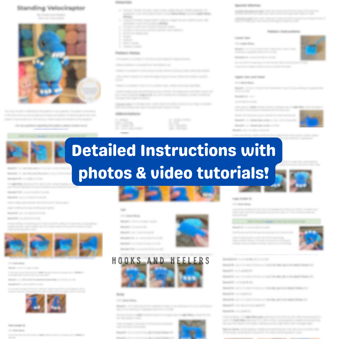 The Standing Velociraptor is a low-sew PDF DIGITAL DOWNLOAD written in US terms. This pattern includes lots of video tutorials and photos!