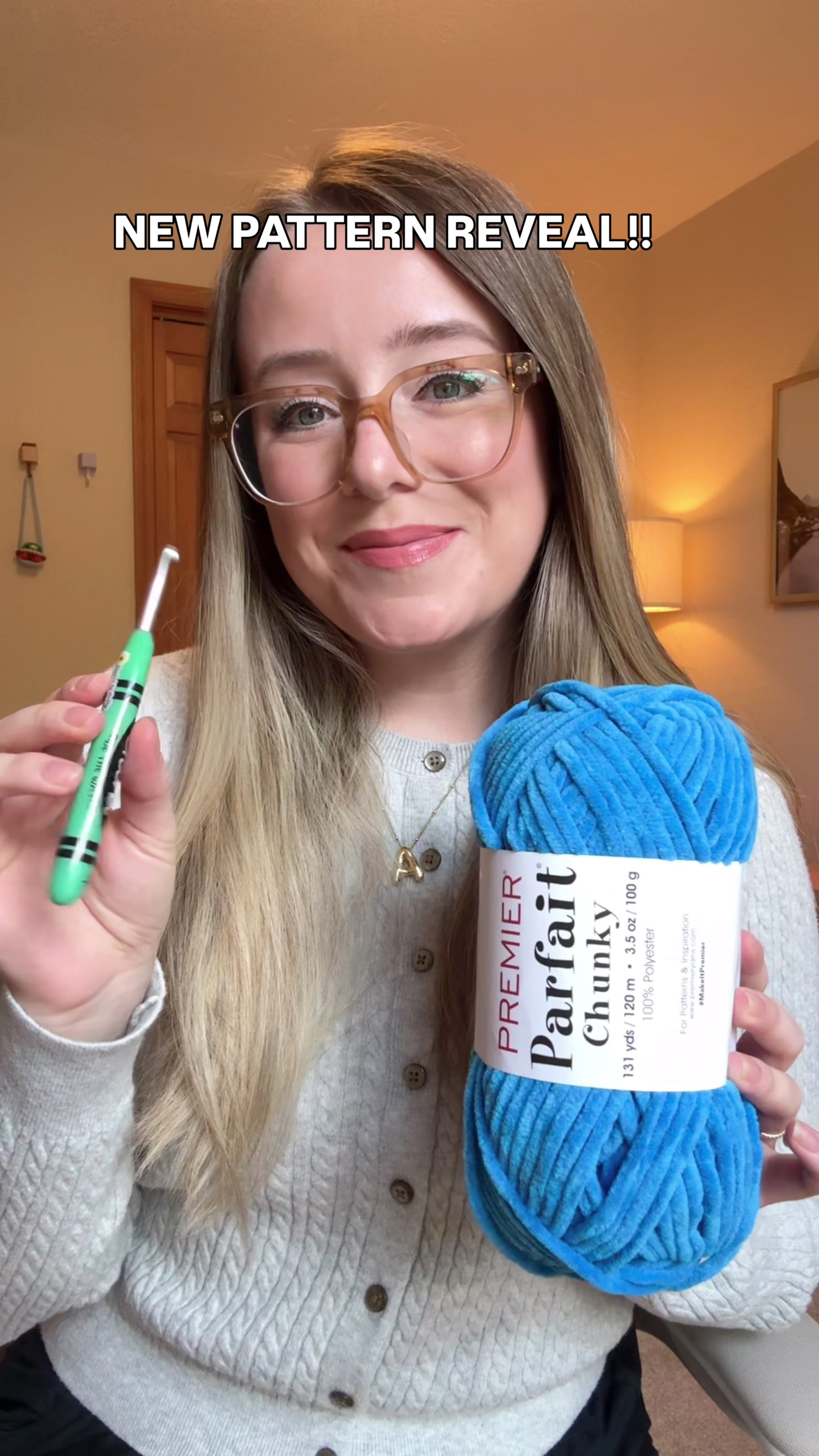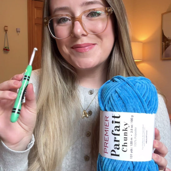 -Premier “Parfait Chunky” super bulky weight #6 yarn [100% polyester, 131 yards/120 m per 100 g skein]; Rock Candy (Dark Blue), Seaside (Light Blue), (White)